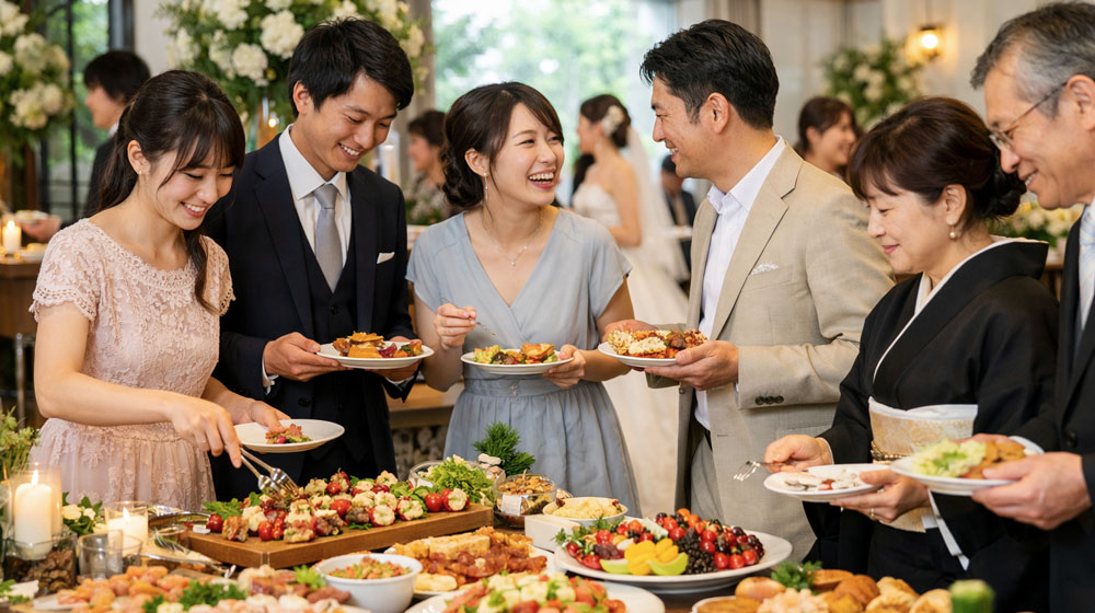 ゲスト構成に合わせた料理選びができると、ビュッフェの満足度が大きく上がります。新郎新婦は、年齢層、食の好み、服装を想定して料理を組み立てることが重要です。