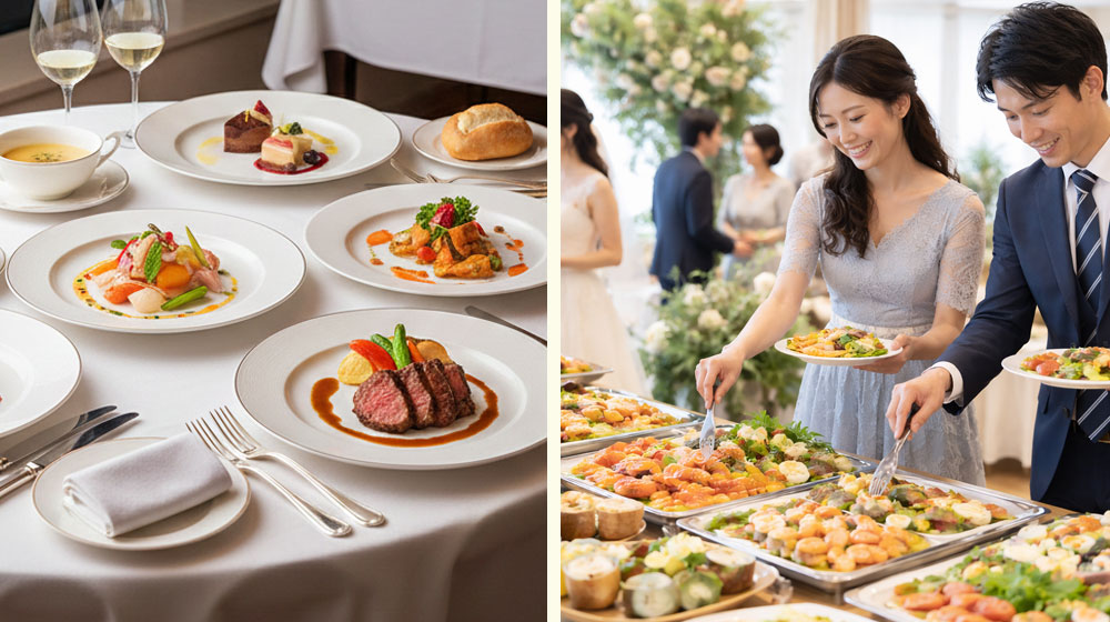 コース料理は、一皿ずつ最高の状態で運ばれてくるため、ゲストは移動せずに会話や演出に集中できます。対してビュッフェ料理は、選ぶ楽しさがある反面、ゲストが席を立つ必要があります。以下の表に、それぞれの特徴をまとめました。