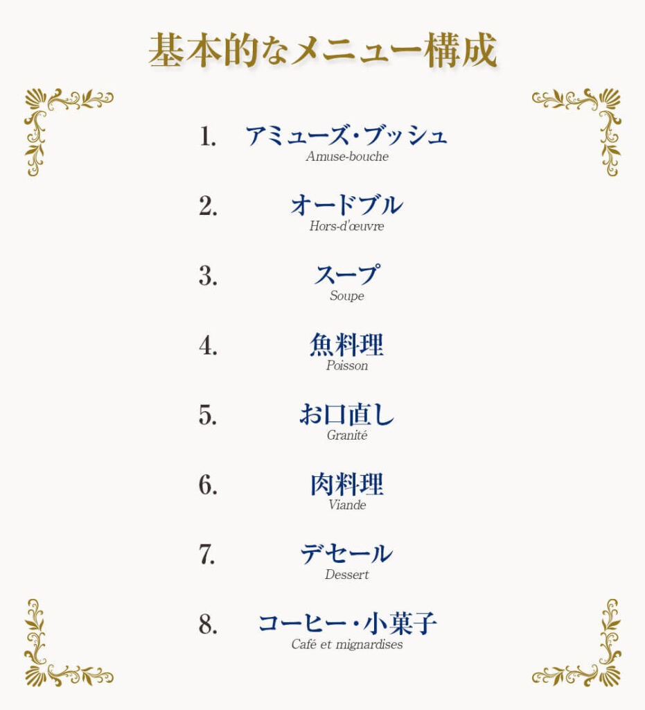 結婚式のフランス料理の基本構成は、軽い一口で始めて、前菜とスープで食欲を整え、魚料理と肉料理で満足感を高め、デザートと飲み物で美しく締める流れです。